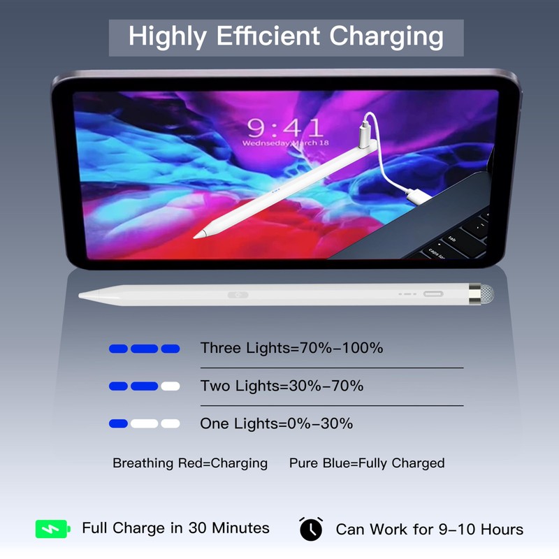 - 【Pushbutton switch】No longer have to worry about accidental triggering causing power on/off,The new breathing style 3 indicator light shows the power of the stylus. When charging, the red breathing light will flash, indicating normal charging. When the 3 blue lights are on, it means charging is complete