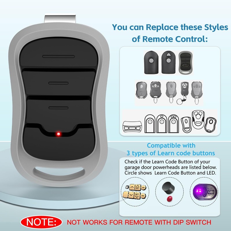 • Auto-Seek Dual Frequency: The replacement garage door opener remote accesses strong, secure signals to minimize interference and improve overall performance. This keychain/visor remote can operate up to 3 garage door openers.