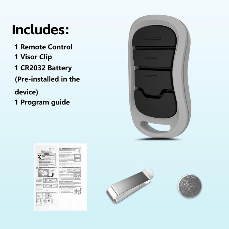 • Simple Storgage and Use: This garage door opener remote includes visor clip, battery and instructions. Can also fit on keyring if desired.