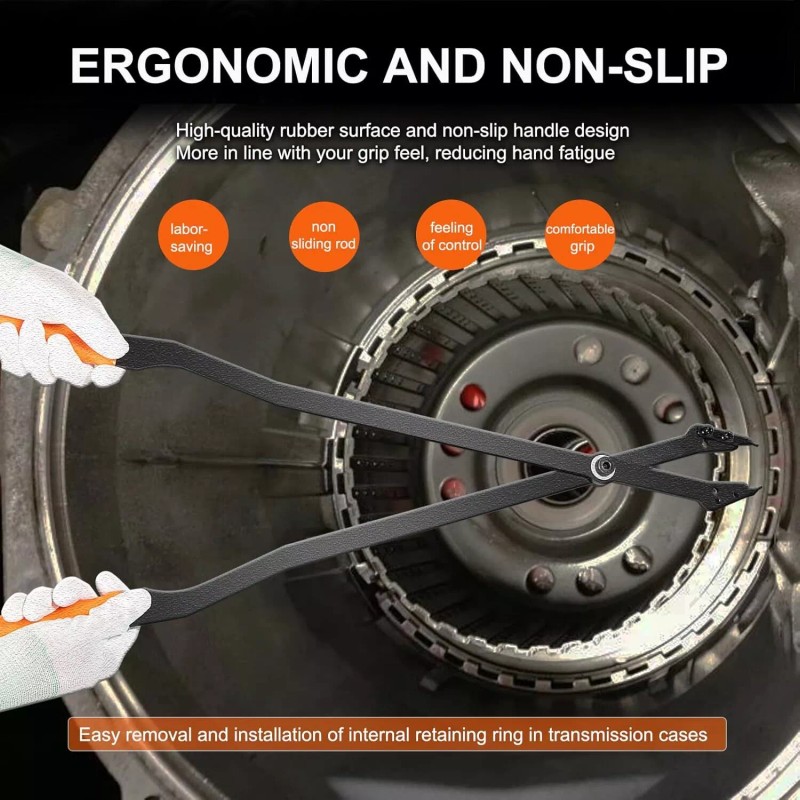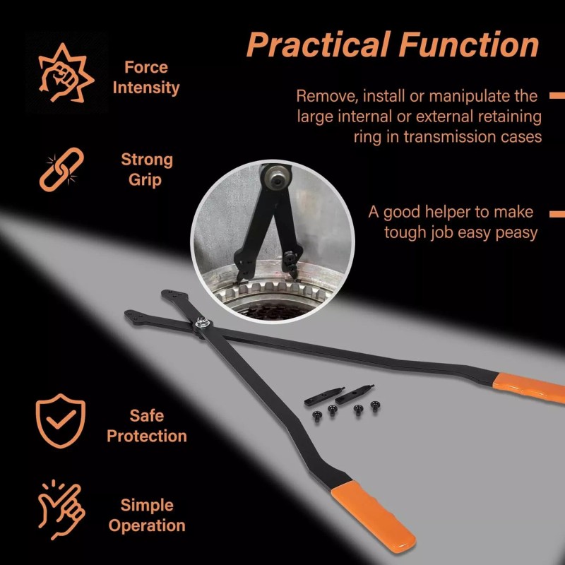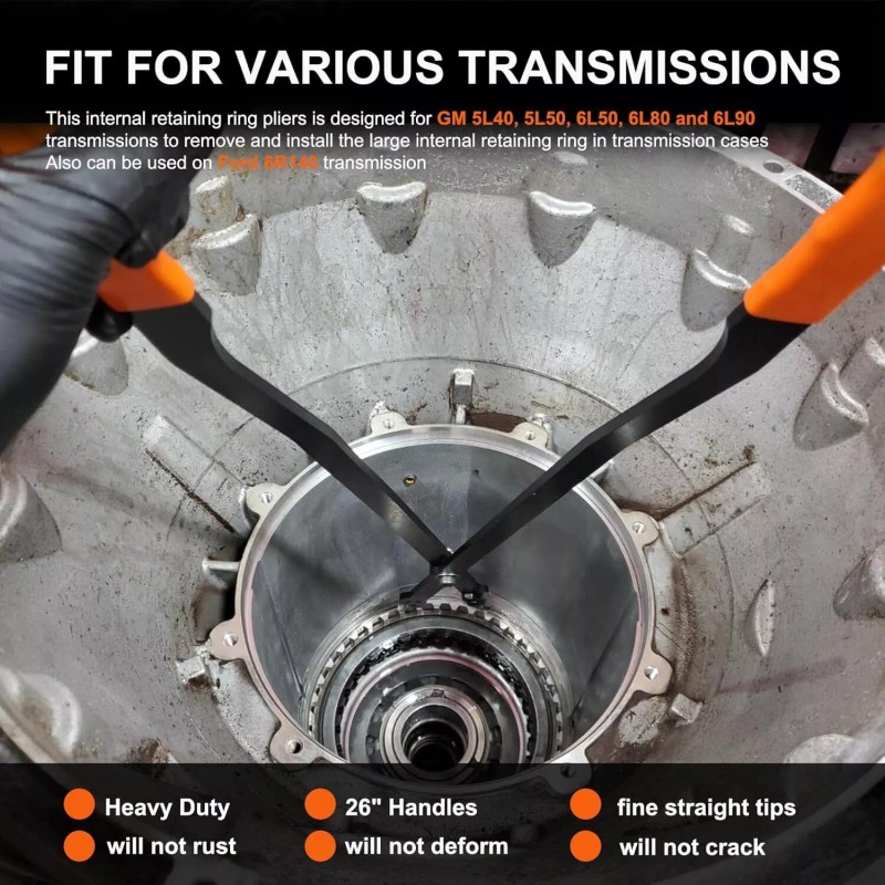 2) The 26” internal retaining ring pliers provide the leverage needed to compress large retaining rings. It is long enough to catch the internal retaining ring of transmission; Total Length: 26 inches