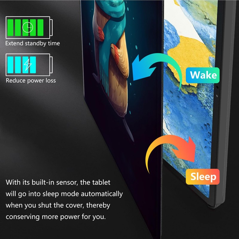 - ✔【Auto Wake/Sleep】With its integrated intelligent sensor, the tablet automatically awakens or enters sleep mode when the cover is opened or closed. This user-friendly feature allows you to enjoy your time without the need to frequently charge the device.