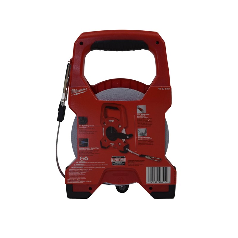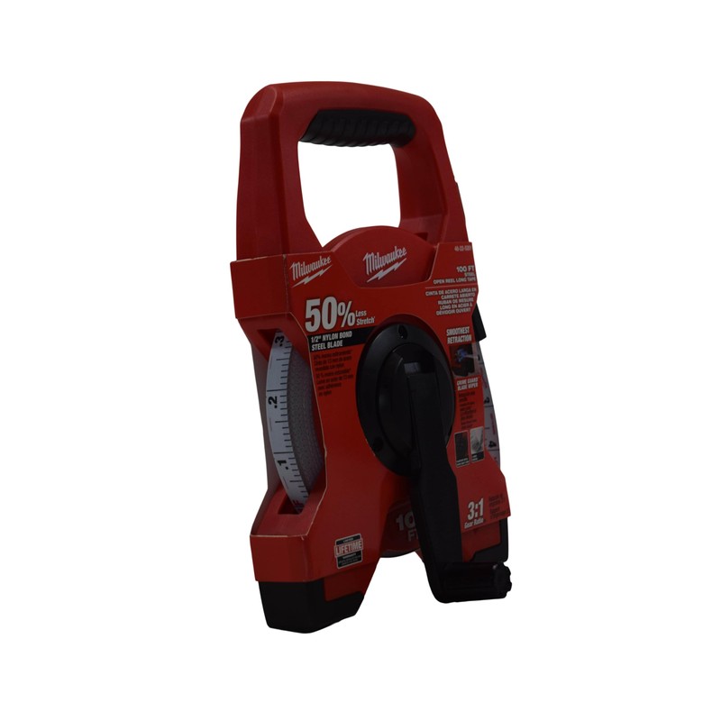 Milwaukee's 100' Steel Open Reel Long Tape features a Blade Wiper for the smoothest retraction and to wick away jobsite contamination. This open reel measuring tape with a steel blade delivers you up to 50% less stretch than fiberglass long tapes. Reinforced 3:1 Planetary Metal Gears won't strip, increasing the life of the long tape measure.
