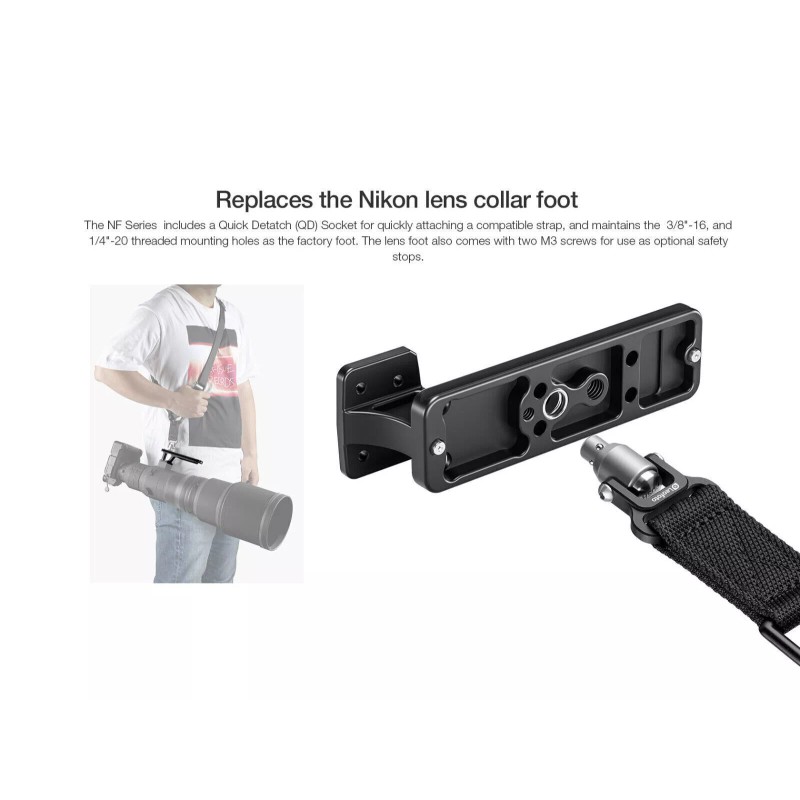 Aiming to improve on the default design, the NF-6 replaces Nikon's original lens collar foot and provides a lower profile and a lower center of gravity for better balance. Two safety stops are located on the bottom of the foot, which prevents accidental lens release when a quick-release receiver clamp is partially open.