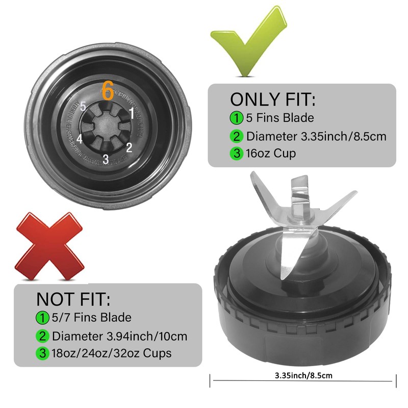 - Attention: This is 3.35inch 6 fins male blade/8.5cm diameter. Only replacement for 16oz ninja blender cups, ensure your blender cup has "4 Tabs" before purchasing.
