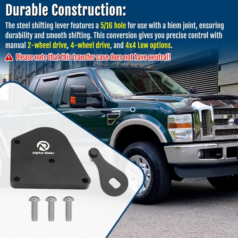 - Durable Construction :The steel shifting lever features a 5/16 hole for use with a hiem joint, ensuring durability and smooth shifting. This conversion gives you precise control with manual 2-wheel drive, 4-wheel drive, and 4x4 Low options. Please note that this transfer case does not have neutral!