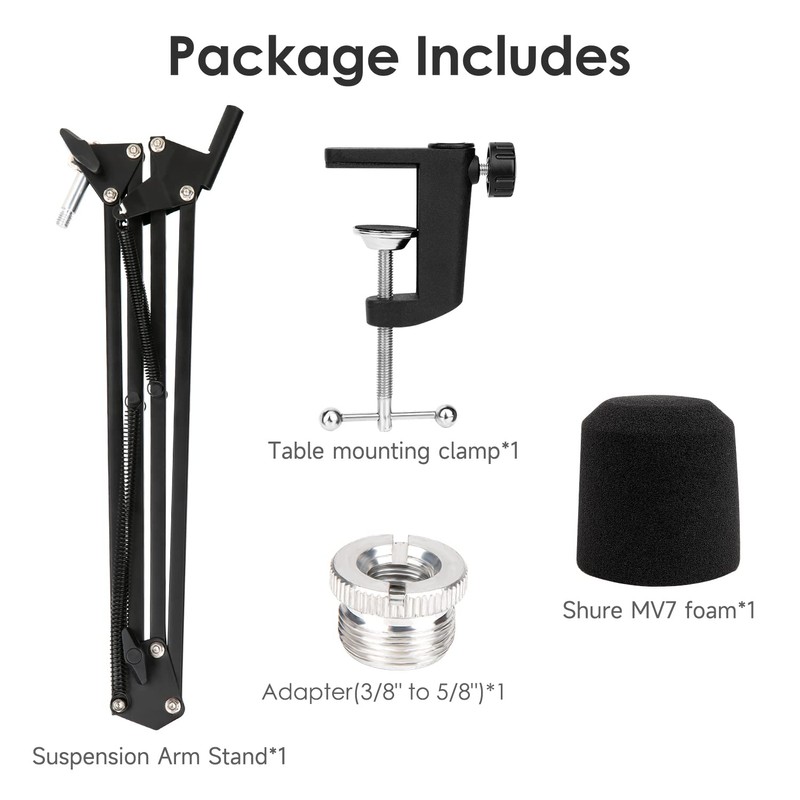 - 【Microphone Stand Accessories】 - Including: 1x MV7 boom arm, 1x Foam Pop Filter, 1x Table mounting clamp, 1x adapter (Fit 3/8" to 5/8" aperture). Note: Product does not include MV7 microphone.