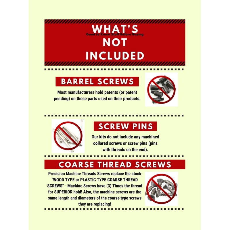 • Coarse Thread Screws for wood or plastic – Replaced with precision-engineered machine thread screws for superior grip. You're welcome!