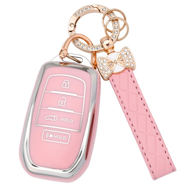 for Toyota Key fob Cover, 4 Buttons Soft TPU Key Fob Case for Toyota Crown Corolla Cross Grand Highlander Tundra Prius Venza Sequoia Land Cruiser Car Key Cover with Bling Keychain (Pink)
