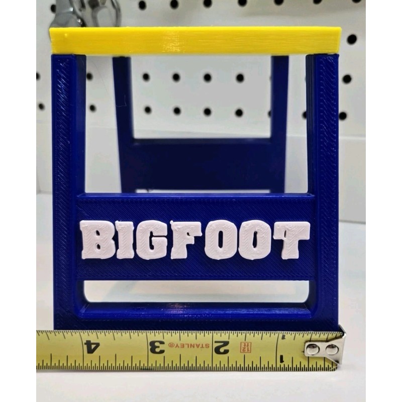 This sale includes a fully assembled custom made to order Traxxas Big Foot Stand with Dark Blue background (Legs) and White Lettering with a Yellow Top.