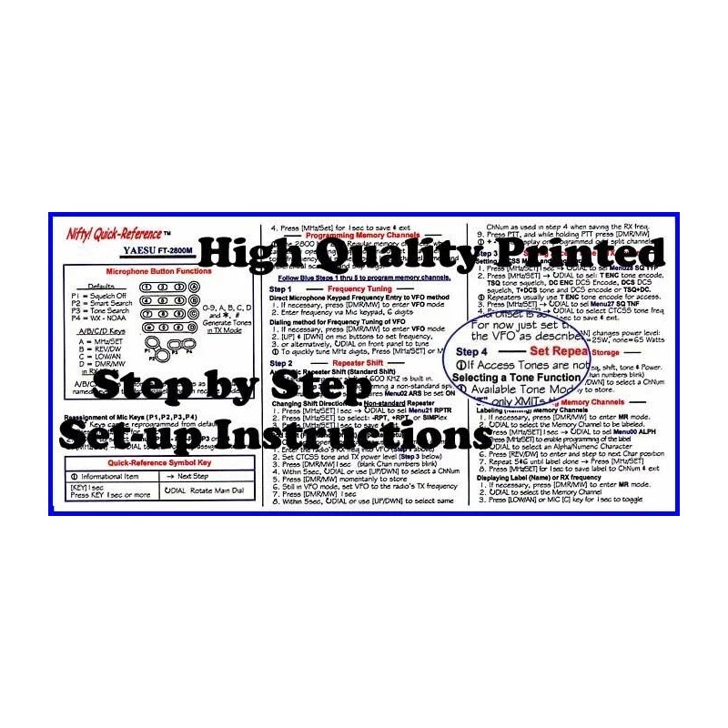 Quick Reference Card. Heavy duty laminated short-form card, the size of commonly used highway maps, for convenient storage in a car-door map-pocket or the glove box. High quality printing on both sides. Nifty! Mobile Transceiver Reference Card
