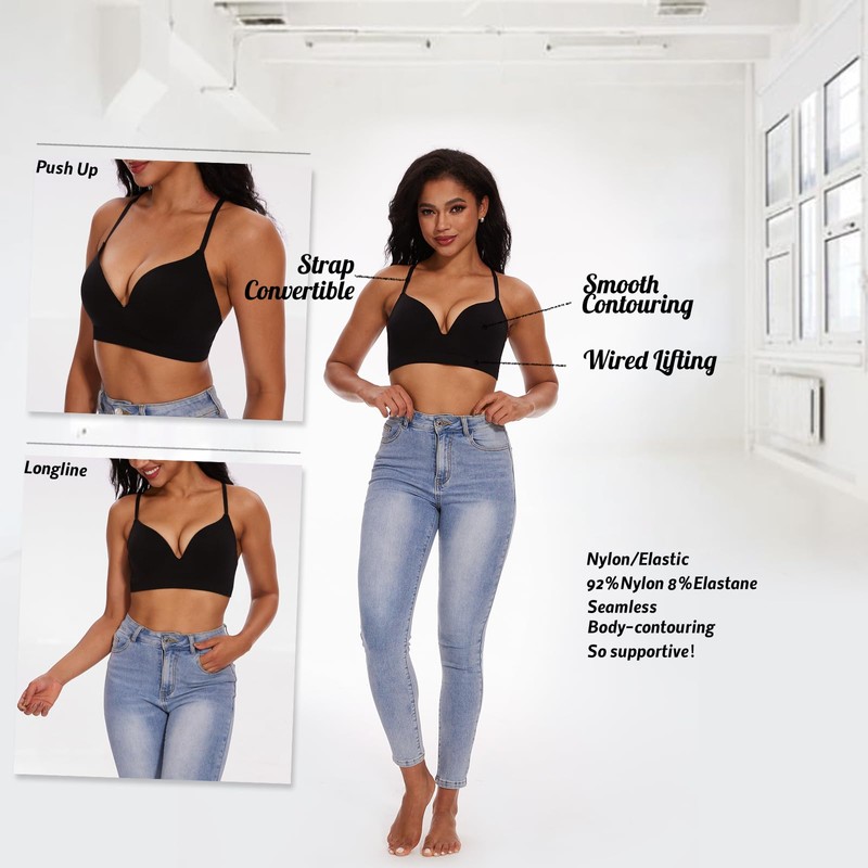 • Convertible Backless Bra;Low back shape with strap multiple convertible.Push up bra that works with every outfit, Multiway straps can be worn cross back or straight, backless with strap convertible onto side hook.Low back bra for dress.