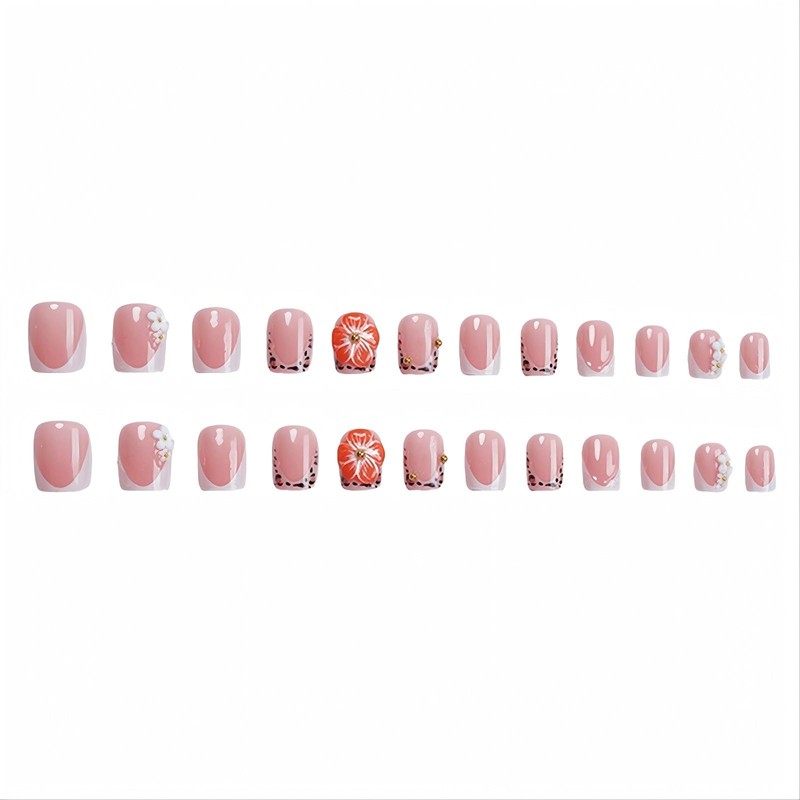 FORBELOVED NAILS|French Tip Leopard Press On Nails |Short Square Stick On Nails|Sparkly 3D Flower,Water Ripples False Nails For Women And Girls|12Sizes-24Pcs/Set With Glue|(Nude-SS)|FOB