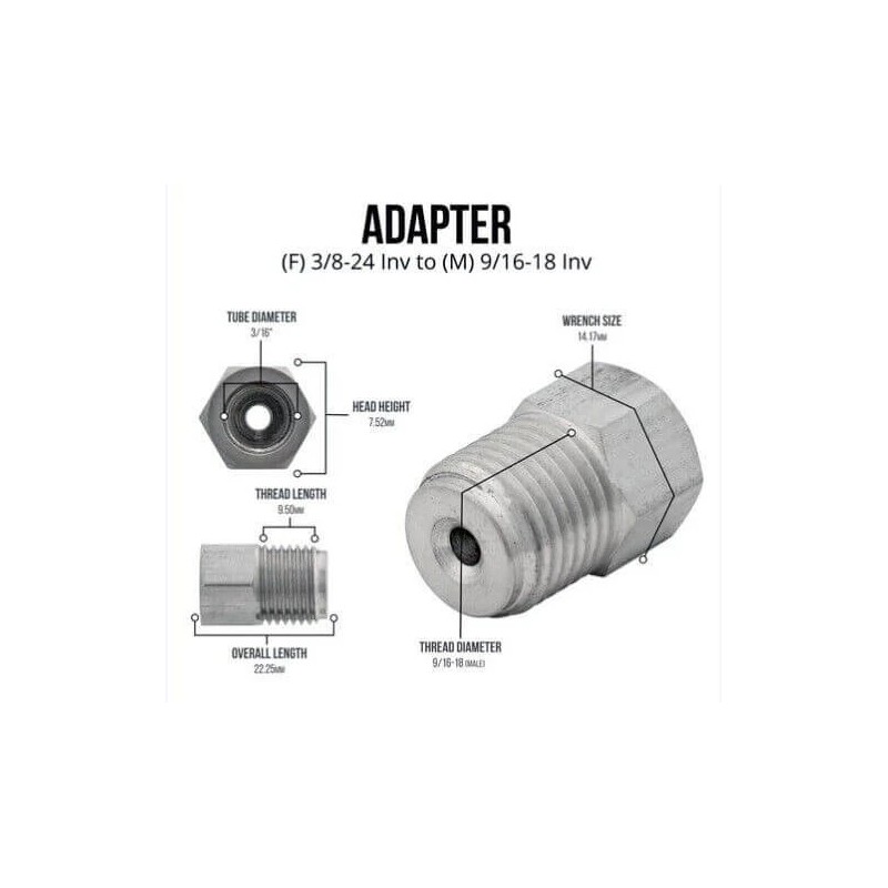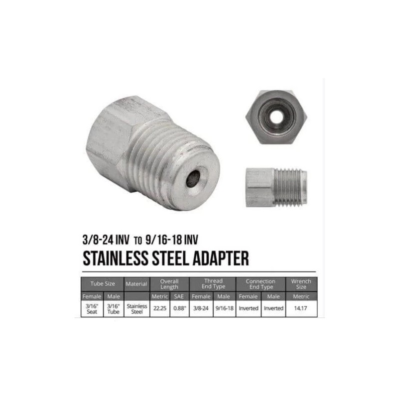 Force 10 Brakes 3/16" Tube line adapter 9/16-18 male 3/8-24 female, Stainless Steel adapter