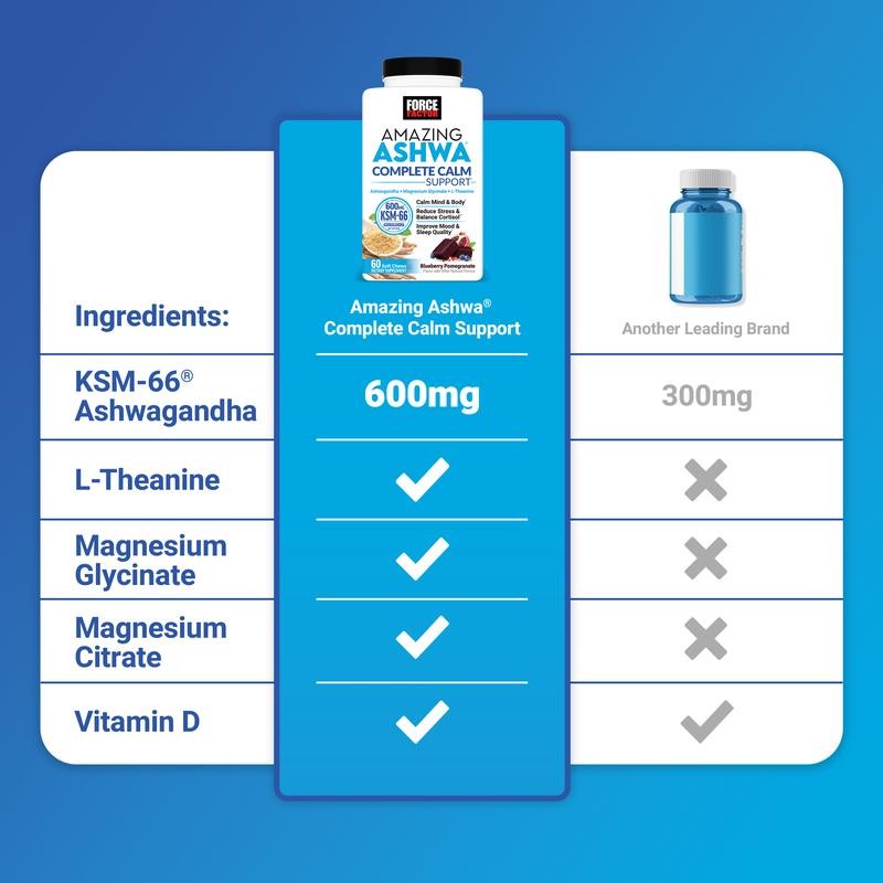 - Force Factor Amazing Ashwa Complete Calm Support with KSM-66 SAshwagandha, Like Ashwangandha Gummies to Promote Calm Relaxation with Magnesium & L-Theanine, Blueberry Pomegranate, 60 Soft Chews for stress relief