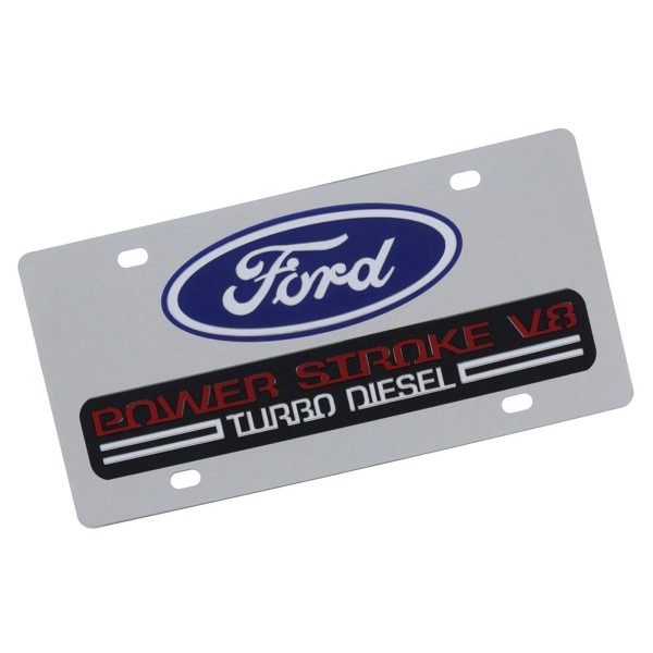 Ford Dual Logo Power Storke V8 License Plate (Red On Chrome)