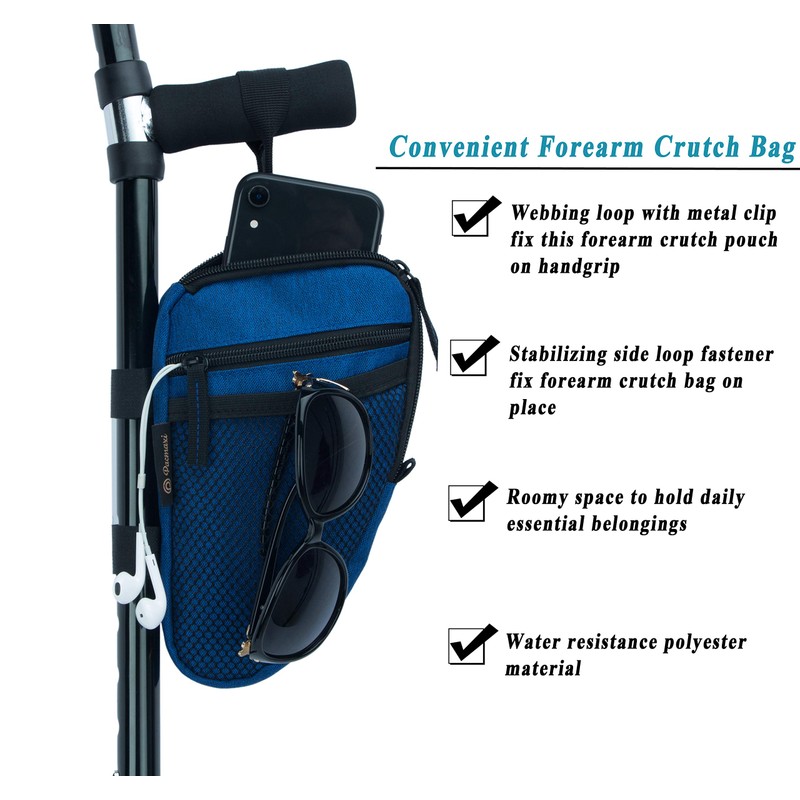 - ✔ Easily install on forearm crutch: 1 top webbing loop with clip easily install forearm crutch storage bag on forwarm crutch. 2 side velcro straps enhance crutch bag to fix it on place, not tangling. With this smart design, this forearm crutch accessories storage pouch placement will not interfere with handgrip.