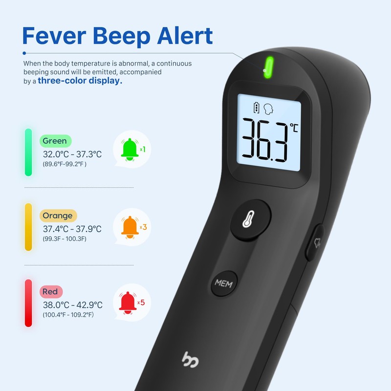 • ✔️Colour-coded Indicator: The color-coded display light will glow green, yellow, or red, providing a visual indication of the temperature reading based on measurement results. Additionally, it emits a short beep to alert you to an elevated body temperature.