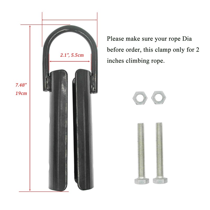 - FIT FOR 2.0” ROPE, the clamp fits any climbing rope with 2.0" diameter. Use bolts to ensure the clamp tightens around your rope for maximum safety and an efficient workout. The rope clasp has a max load of 400 lb, the load may also depend on your rope.