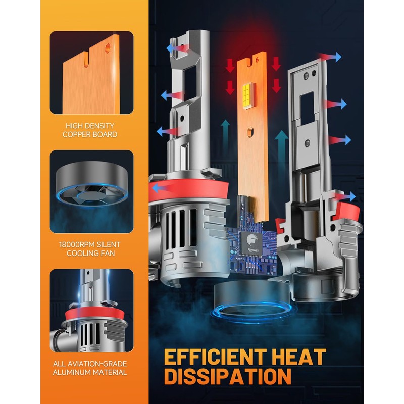 - 【Unmatched Longevity Over 60,000 Hours】Crafted from premium aviation-grade aluminum, strengthened with dual copper substrates, and featuring a silent 18000RPM turbo fan, Forenner's latest H9 H8 HB3 bulbs excel in rapid and efficient heat dissipation, eliminating frequent bulb replacements.