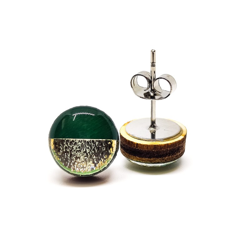- Stud Earrings, Forest Green annd Gold Faux Hammered Metal, 10 mm, Handmade, Posts for Sensitive Ears. Each pair of earrings are light, unique, and fashionable. The earrings are lightweight that is sure to make a statement. Every pair is handcrafted, and hand painted and made at Candi Cove’s studio in Idaho. Explore our selection of stud earrings, where you'll find options to suit everyone's style, for women's boho and fun-inspired pieces as well as unique men's designs.