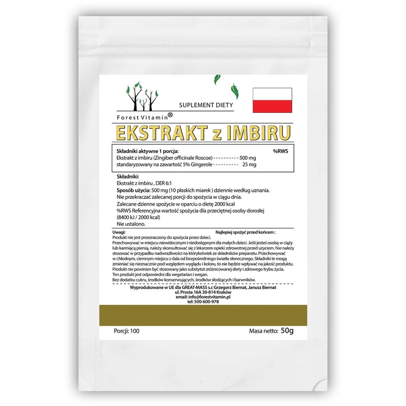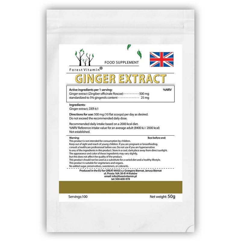 - Ginger extract (Zingiber officinale) is a high-quality dietary supplement that provides a concentrated form of active ingredients from the ginger root. The product has been standardised to a content of 5% gingerols, which guarantees consistent quality and effectiveness.