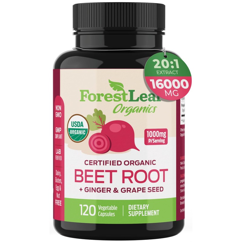 ForestLeaf Organic Beet Root Capsules - Beetroot Supplement 16000mg Strength 20:1 Extract Pills w/Ginger Grape Seed | Support Blood Pressure, Nitric Oxide, Flow, Circulation | Beets Powder - 120 Caps