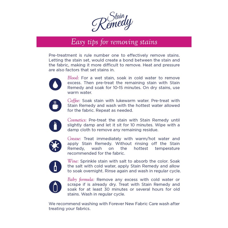 - EASY APPLICATION – Forever New’s Stain Remedy allows you to apply, set, and forget about those pesky stains.