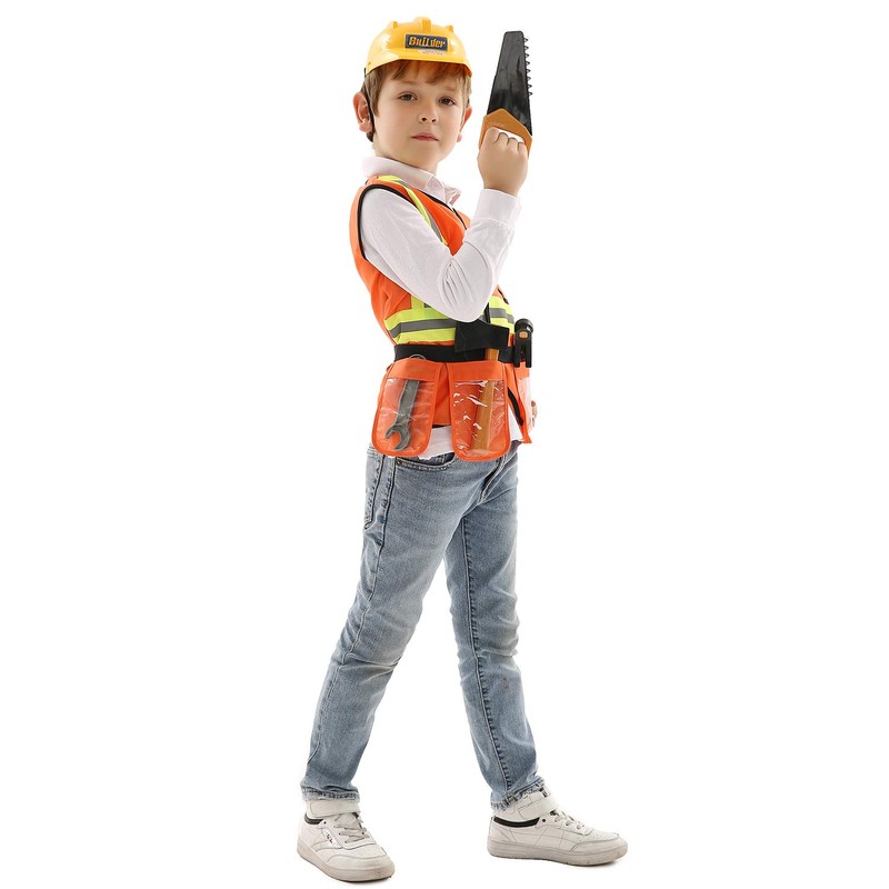 - Work zone ahead! Your little construction worker will be ready for the job with this bright orange, machine-washable, vest high-lighted with reflective material and a tool belt, a yellow hard hat, a hammer, a saw, and an axe.