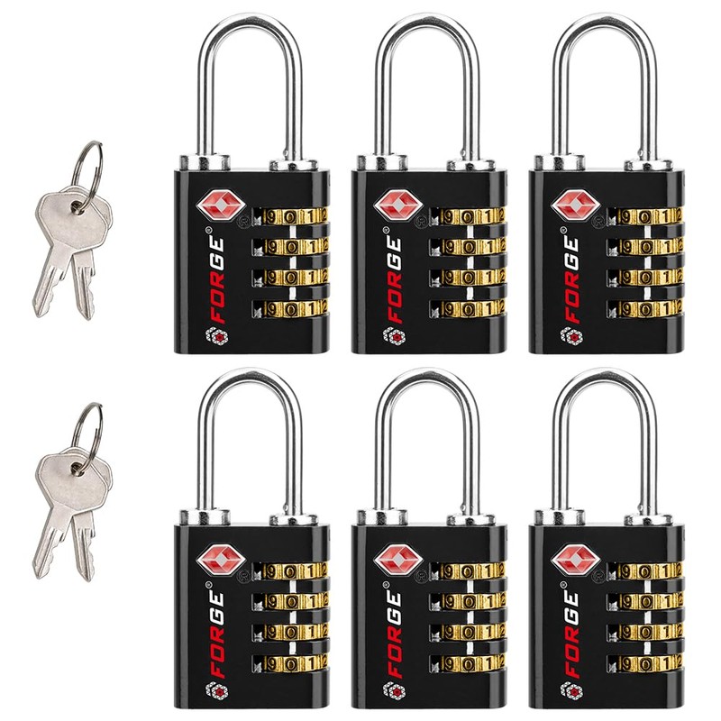 Forge Dual-Opening: Key or Combination Access Lock, TSA Approved Locks for Luggage, Pelican case, Travel, Gym, School, Stainless Steel Shackle.(Black 6 Pk)