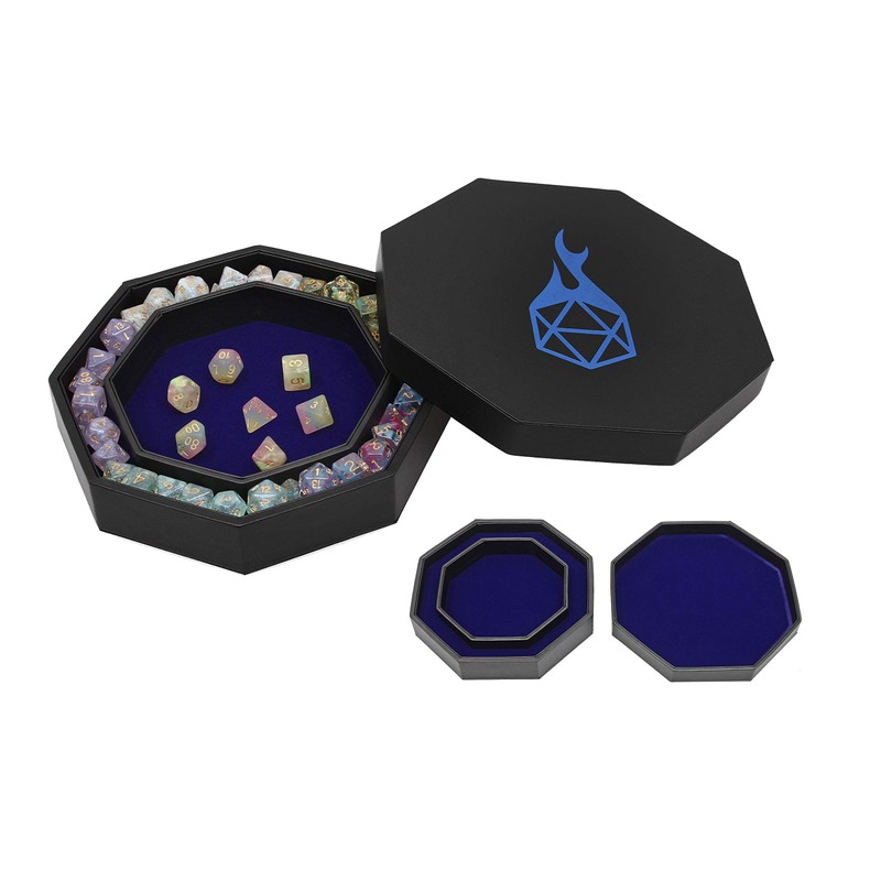 - Dual purpose rolling tray and storage. Holds up to 125 standard polyhedral dice. Lid comes off and can be used as another rolling tray.