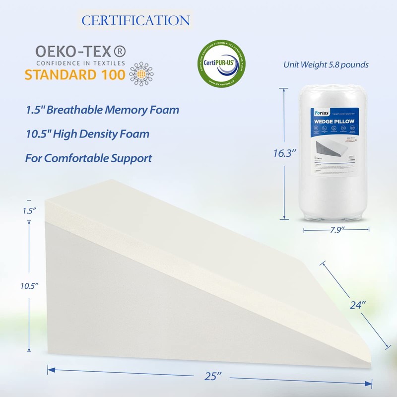 - 【 Certificated Wedge Pillow】: Forias wedge pillow for sleeping is an incredibly comfortable bed wedge pillow for a relaxing night's sleep! 1.5" breathable memory foam top and 10.5" high density foam core ensures better comfort and great support. Certificated by CertiPUR-US and Standard 100 by Oeko - Tex.