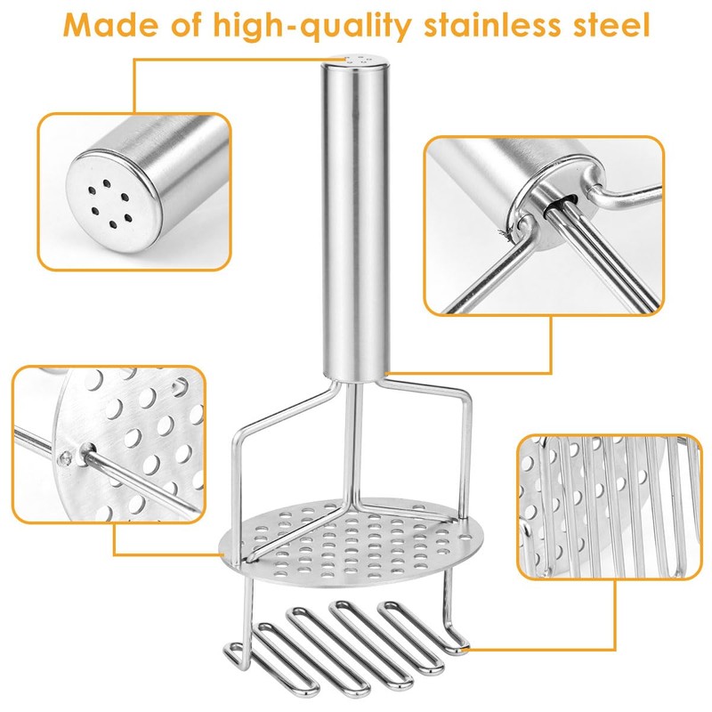 - [2-in-1 Dual Potato Masher] This potato masher combines a linear masher and a hole-shaped masher into one, dual potato masher and crusher in one action, saves time and effort, makes the mashed potatoes smoother and creamier in texture with no lumps. It is also an ideal tool choice for mashing apples and bananas as homemade baby food.