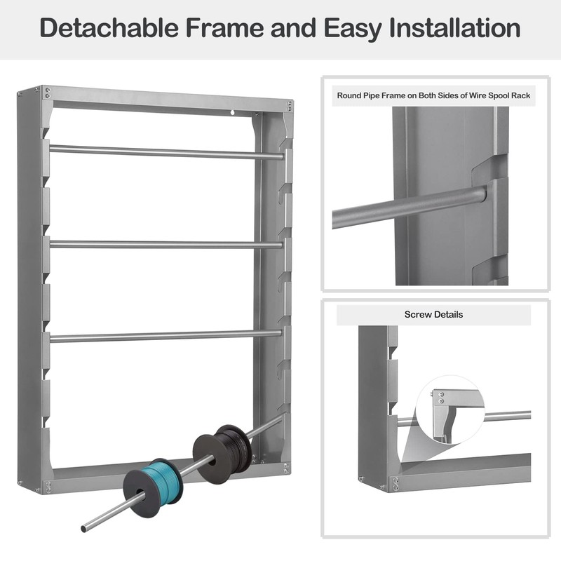 - đăEasy to Installă: Wall wire spool rack Install staggered on both sides of the wire spool storage round rod. Large spool rack screws are included in the package to help people quickly assemble the wiring harness frame, saving time and effort.