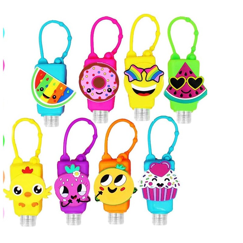 • Adorable Designs: Set of 8 fun and playful hand sanitizer holders featuring cute characters like pizza, donuts, watermelon, and smileys.