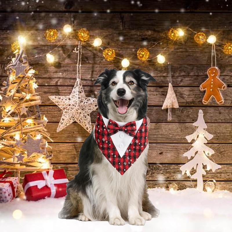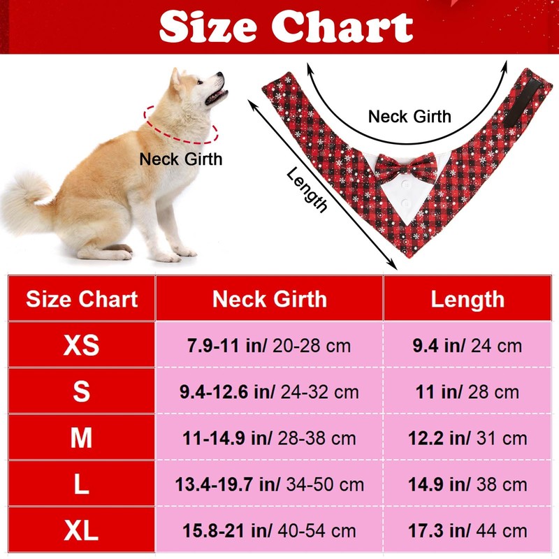 - Christmas Dog Tuxedo Bandana: Designed with formal dog tux style, elegant bowtie, classic red plaid with snowflake pattern, full of christmas atmosphere, Wearing this formal dog bandna costume, let your dog looks like a gentleman during christmas season