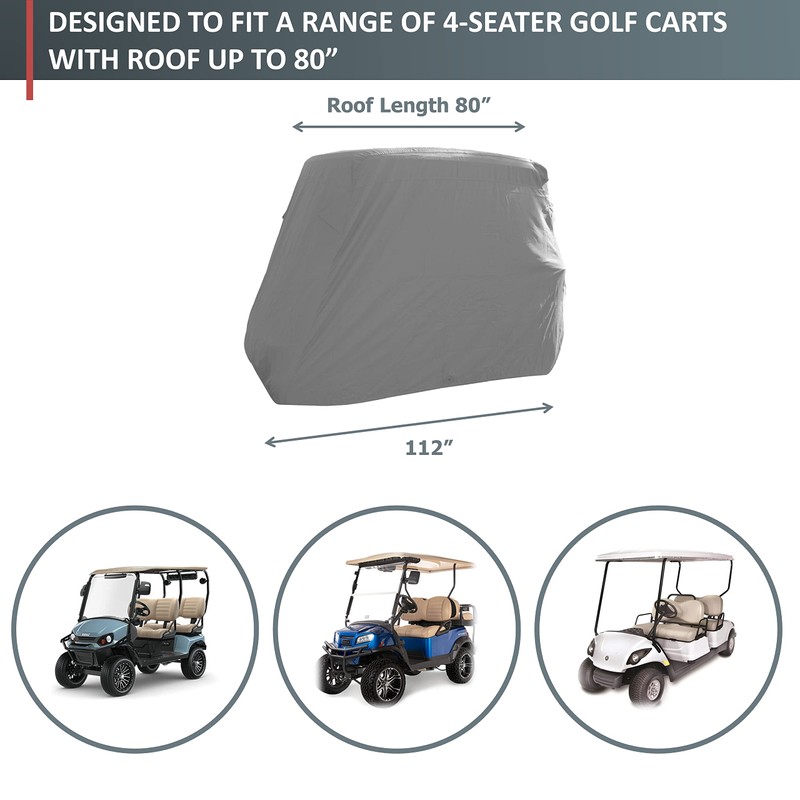 - Fits most 4 seater golf carts with an 80" L roof, including EZ GO, Club Car, Yamaha G model, and GEM e2. Actual measurements of cover: 112-inch L x 48-inch W x 66-inch H Color: Grey.