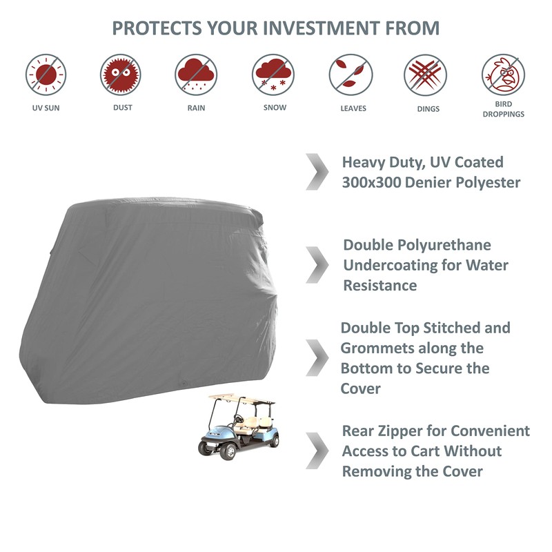 - Protect your 4 passenger golf cart with our Formosa Covers' Golf Cart Cover, which is made of heavy-duty, UV-coated satin Polyester and double Polyurethane undercoating for maximum water resistance.