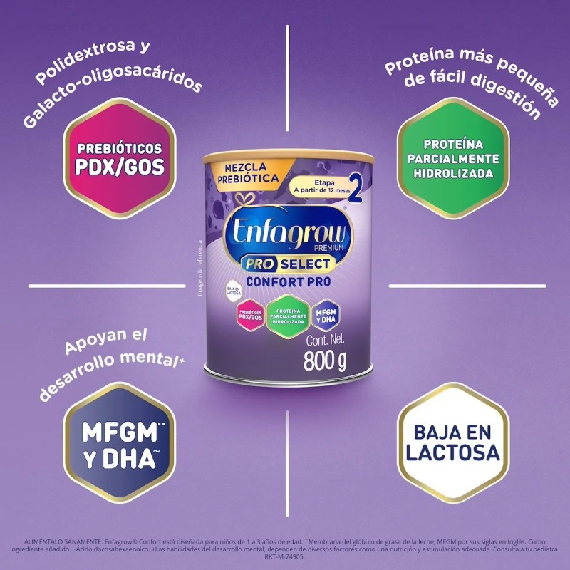 Descripción Limpia: Enfagrow Premium Pro Select Confort Pro, es una fórmula de continuación para niños a partir de 12 meses, con necesidades especiales de nutrición, con proteína parcialmente digerida (hidrolizada) y baja en lactosa. Con DHA (Ácido Docosahexaenoico), ARA (Ácido Araquidónico), vitaminas y minerales.