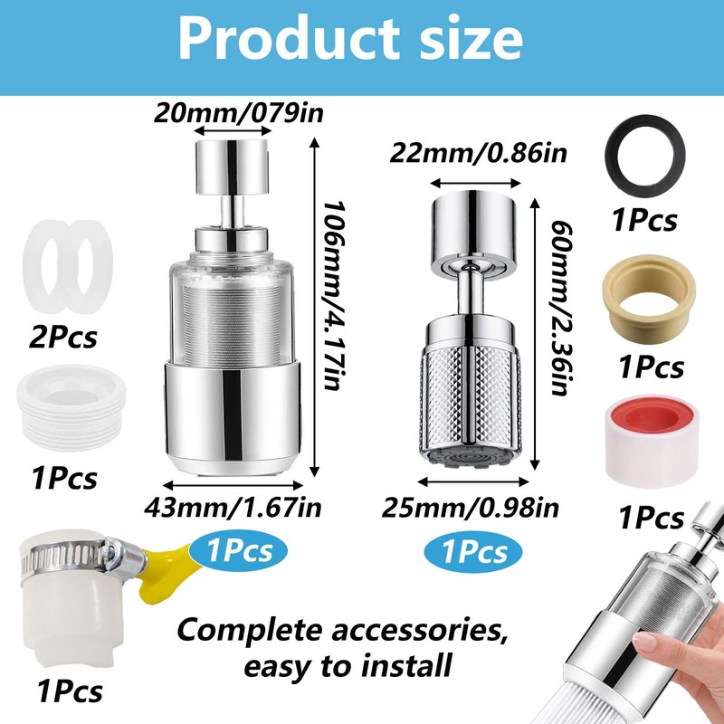• Box contents: our set contains 2 360 degree rotating tap attachment: one with two and one with three adjustable flow levels. Integrated filters, seals and adapters ensure easy installation and safe water quality.