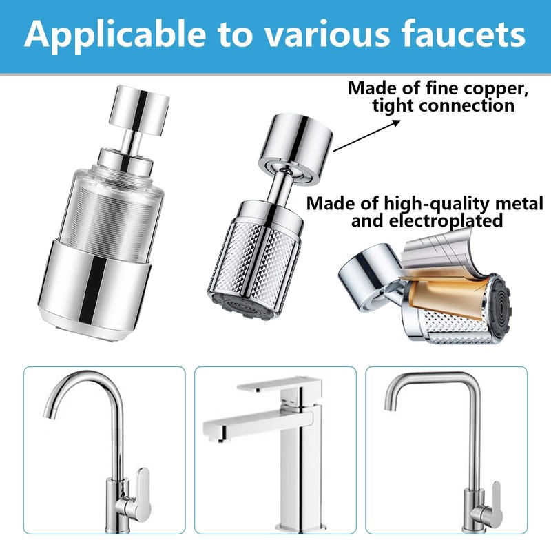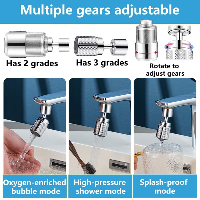 • Multiple water flow modes: our rotating tap attachment has two or three adjustable flow levels. Simply turn the nozzle to switch between different convenient water flow modes: gentle splash protection mode (for washing fruits and vegetables), normal water flow (for daily use) and powerful spray mode (for vigorous rinsing). These modes meet your requirements for dishwashing, washing and cleaning, saving water and preventing splashes.