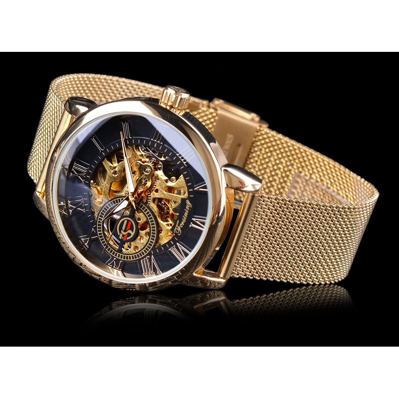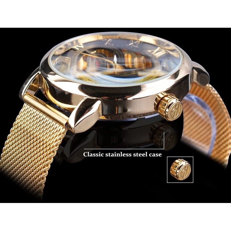 FORSINING Men's Skeleton Steampunk Watch for Men Mechanical Minimalist Retro Golden Wrist Watch Transparent Business Mesh Band Watch