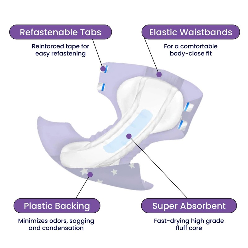 • STARS - You’ll be seeing stars while wearing this AM PM Stars adult brief from Forsite Health! The simple white stars pop against the calming purple print, and are sure to provide a fun diaper-wearing experience.
