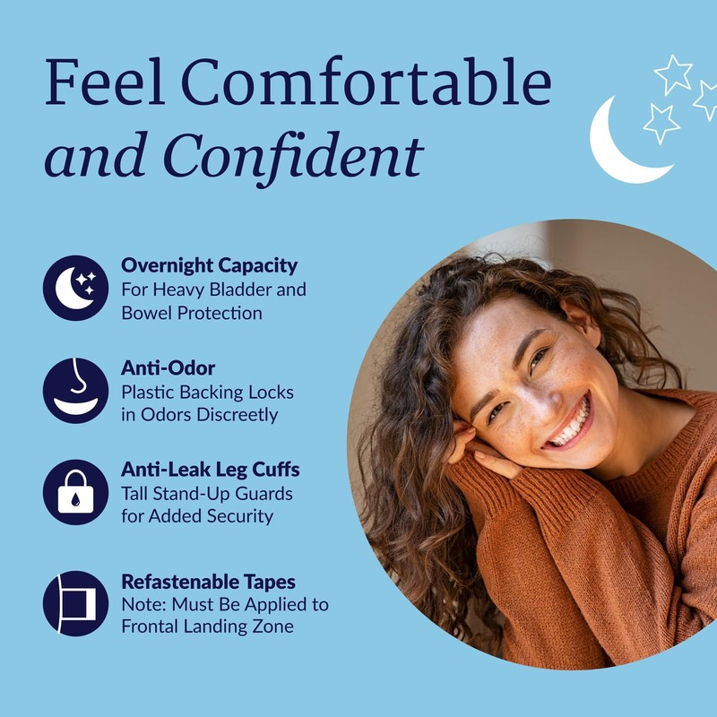 • COMFORTABLE FIT - Choose between the medium or large sizes for your ideal fit. They also feature an elastic stretch waistband on both the front and back, as well as a tall, double leg cuff design. The anatomical design feels great against your skin and comes with strong, easily adjustable tapes, including a frontal tape landing zone, so you can fasten and re-fasten as needed.