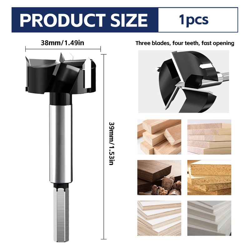 Forstner Drill Bit, 38mm Hinge Cutter Triple-Fluted Auger Drill Bit With Round Shank for Solid Wood Plastic Plywood
