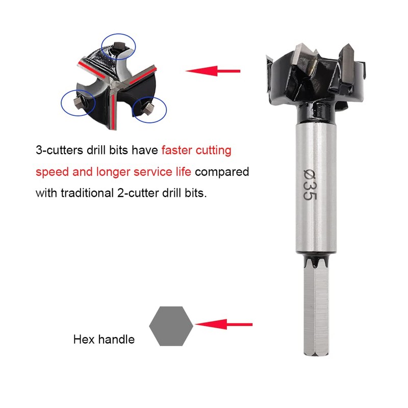 - [SPECIAL DESIGN] 3-Cutter forstner drill bits have faster cutting speed and longer service life compared with 2-cutter ones. Using these sharp drill bits, you can drill accurate, smooth, neat holes without burrs, even in end-grain and through knots. Arc curve design head contributes to removing sawdust faster, making your work more efficient.