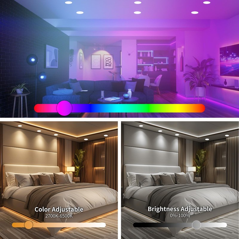 - Smart Lighting: Recessed LED downlights with RGB color changing and cool/warm white, dimmable and sync to music.Transform your home into a SMART HOME with our 6 INCH RECESSED LED LIGHTS! These ultra-thin, 12W 1200LM LED RECESSED LIGHTING are ETL and Energy Star certified, ensuring top-notch quality and efficiency.