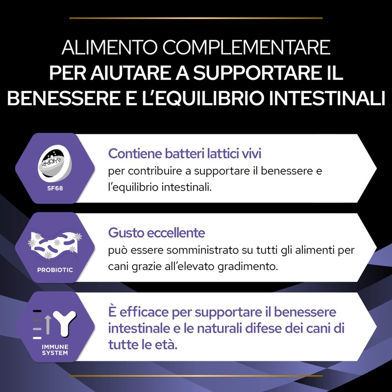 • Purina Pro Plan Fortiflora Canine enthält lebende Milchsäurebakterien, die das Wohlbefinden und das Gleichgewicht des Darms unterstützen.