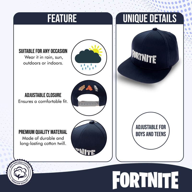 FORTNITE Baseball Cap for Boys, Quality Made Boys Hat and Fitted Cap, Flatbrim Baseball Hat with Sleek Design Navy