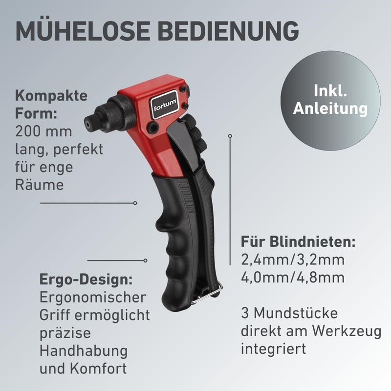 - Various rivet sizes – the rivet gun is suitable for blind rivets, rivet and pop rivets with the sizes 2.4 mm, 3.2 mm, 4.0 mm and 4.8 mm.
