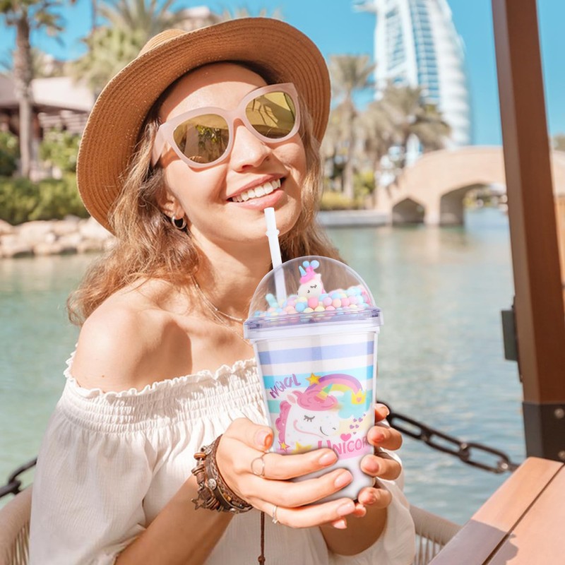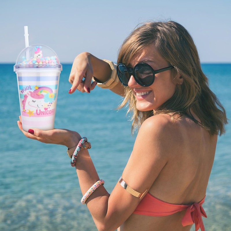-Enchanting design: transparent cup with unicorn print and 3D figure on the lid.